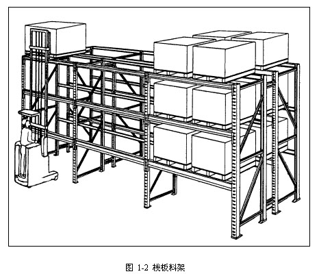 栈板料架 (图1-2) 是使用最普遍的一种料架,提供 100 % 的存取性,并且有很好的拣取效率。但相对地此种料架的储存密度较低,需要较多的信道 ( Aisle ) 。一般可依其存取信道的宽度,区分为传统式信道、窄道式信道及超窄道式信道,后者需配合适当型式的堆高机使用。其特点为: