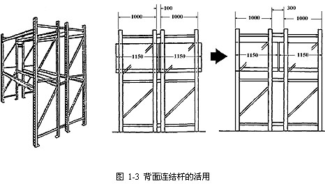 背面连结杆用于两列料架背对背之间的连结,以增加整体的强度。以下图 1-3 背面连结杆的活用为例,承载物深度 1,150 mm ,支柱架深度 1,000 mm ,如选用背面连结杆长度 100 mm ,则会造成承载物突出于料架,因此可选用 300 mm 长度,则可解决上述问题。