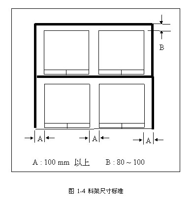 栈板料架的尺寸订定标准如图 1-4 所示,侧边栈板与支柱及栈板与栈板的间隔 (A) 在 100 mm 以上,间隔愈大则愈容易作业。承载物与横梁的间隔(B)在80~100mm以上。