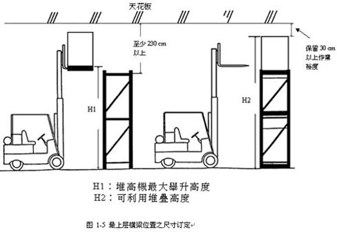 堆高机的最大举升高度会高出最上层横梁位置 200 cm 以上,如图 1-5 所示。因此最上层横梁位置需与天花板至少要有 230 cm 以上的间隙。