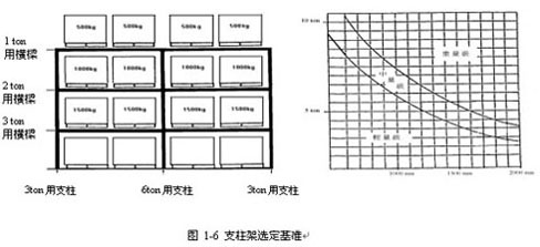 支柱架的耐荷重,须以最下层存取位置所承受的负荷来决定。支柱架的选定例子如下图 1-6 所示,最下层支柱架承受的荷重为 6,000 kg ,最下层横梁的高度为 1,100 mm ,因此可由此两因素对照右图而选定中量级的支柱架。