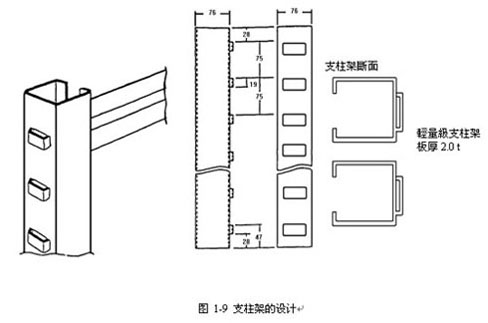 支柱架断面形状的设计各家制造商均有其设计上的考虑,使其承受负载时有足够的强度,不会产生变形。支柱上每隔一定长度会有一卡槽,使与横梁组装时更具有可变化性 ( 如图 1-9 所示 ) 。一般料架制造商在设计支柱架,会设计各种不同高度、宽度等规格的组合,以满足各种料架组装的需求,并搭配不同的断面厚度,可分为重量级、中量级和轻量级等三种。