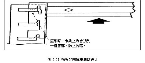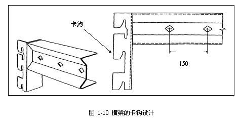 横梁断面形状的设计也是非常多样,设计上的主要考虑,是使负荷时产生最少的挠曲变形。横梁端部有卡钩可与立柱组装 ( 如图 1-10 所示 ) ,而横梁上有固定孔可组装栈板支撑梁。另需有防撞设计,以防止堆高机作业时不小心顶到横梁时,造成与立柱的脱离,一般会使用卡钩方式设计 ( 如图 1-11 所示 ) 。