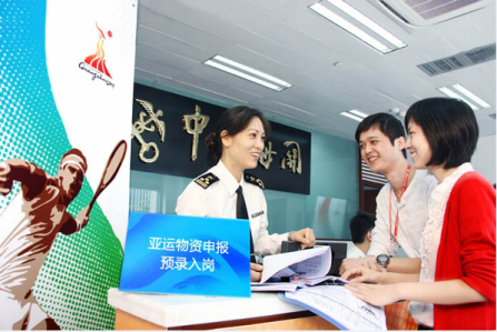 广州海关介绍说,目前,广州海关已采取24小时预约通关服务,供亚运会物资可由亚组委物流中心直接向通关服务中心预约,实现了符合海关监管规定的亚运物资无障碍快速通关。广州海关还根据供亚运会物资数量大、重要性高、分散进口的特点,制定了针对各类物资的数个通关工作方案,各岗位工作人员明确责任、细化任务,确保亚运物资通关工作万无一失。此外,按照“主管地申报、口岸验放、统一管理”的工作原则,广州海关全力打造了亚运物资转关“绿色通道”,对于转关亚运物资制定相应管理措施,提供“一站式”通关服务。