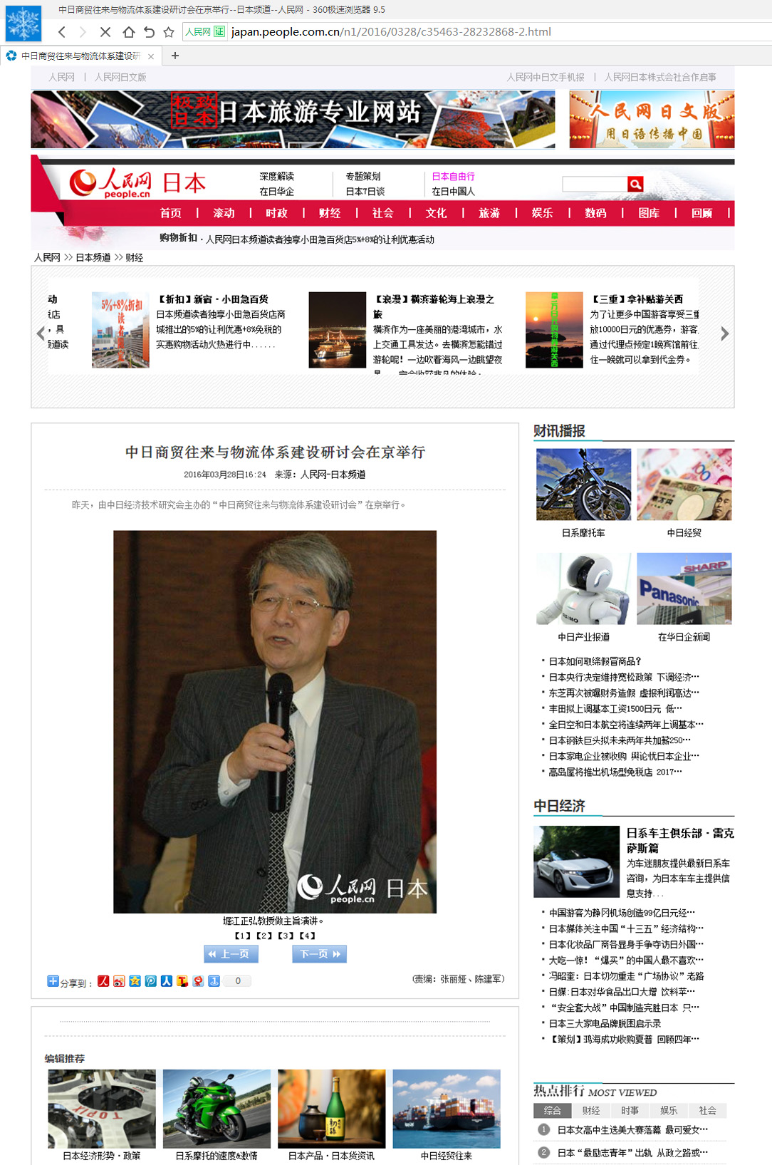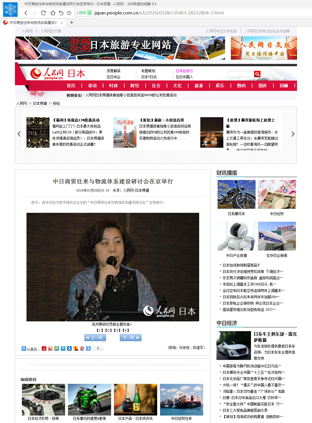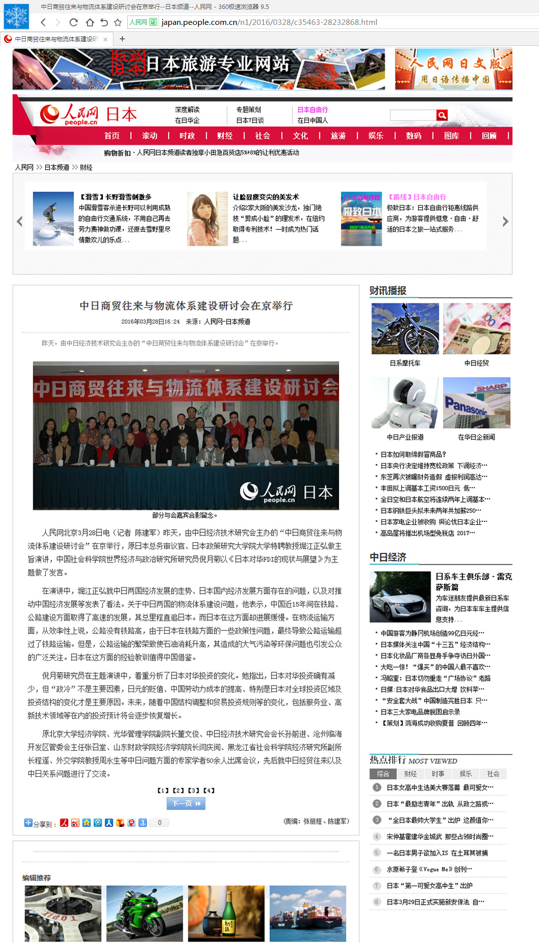 新华网北京2016年3月28日电(记者郭丹 王珊宁)27日,由中日经济技术研究会及北京秦藤日本物流研究会主办的中日商贸往来与物流体系建设研讨会在北京召开。来自日本政策研究大学院大学、中国社会科学院世界经济与政治研究所、新华社世界问题研究中心、人民日报、北京大学现代日本研究班、北京物资学院的各位专家、学者参加了研讨会。